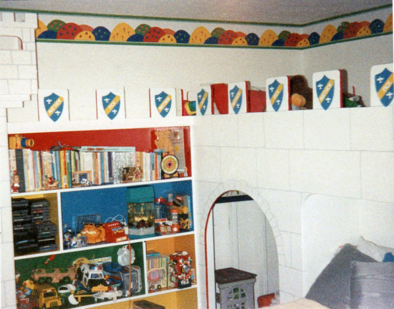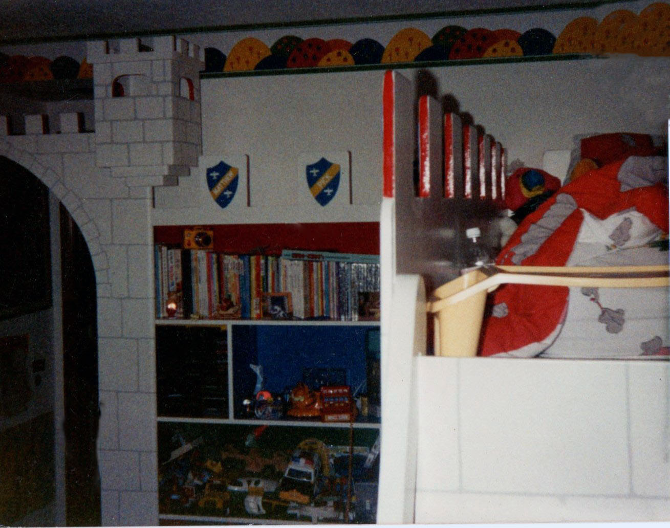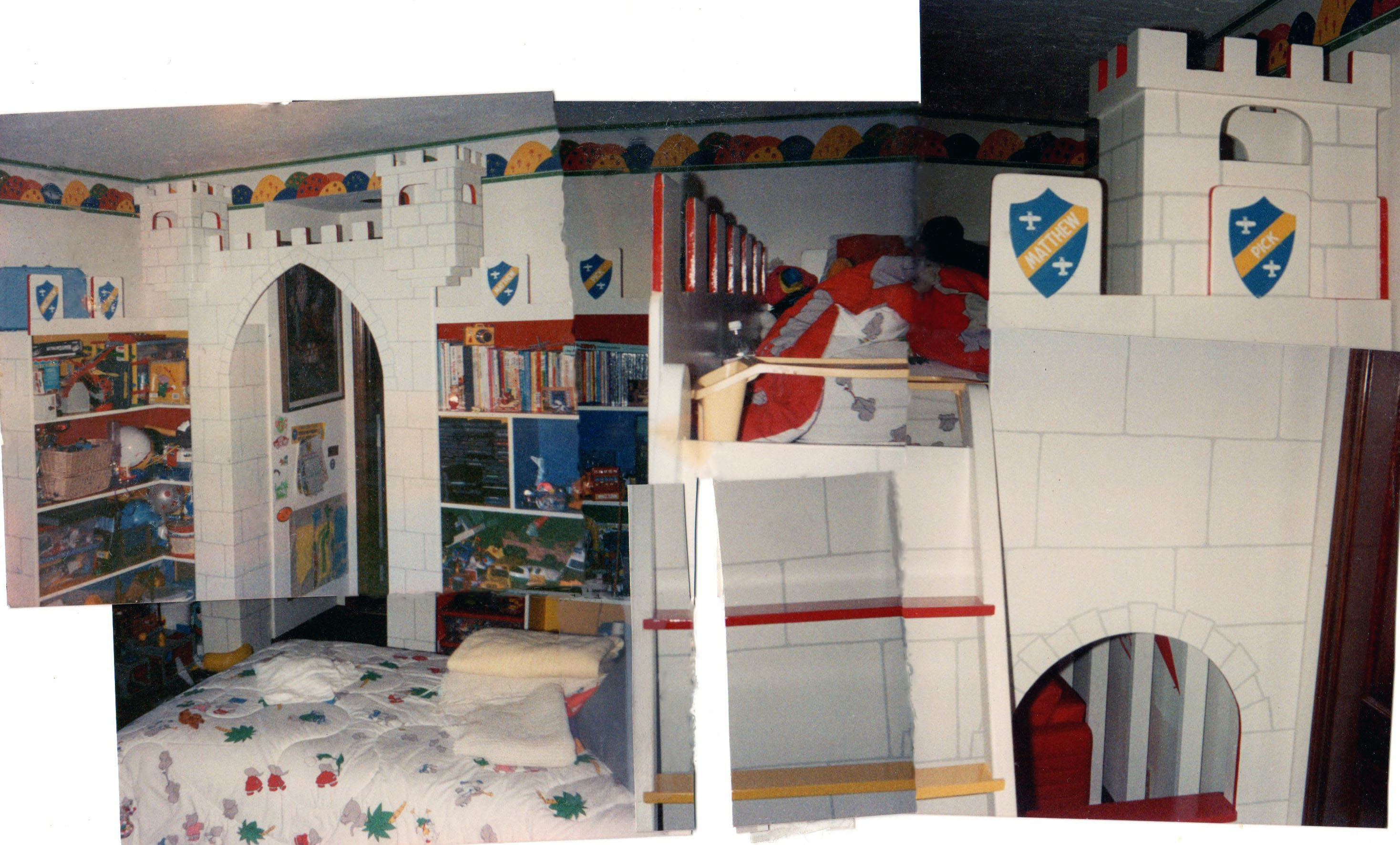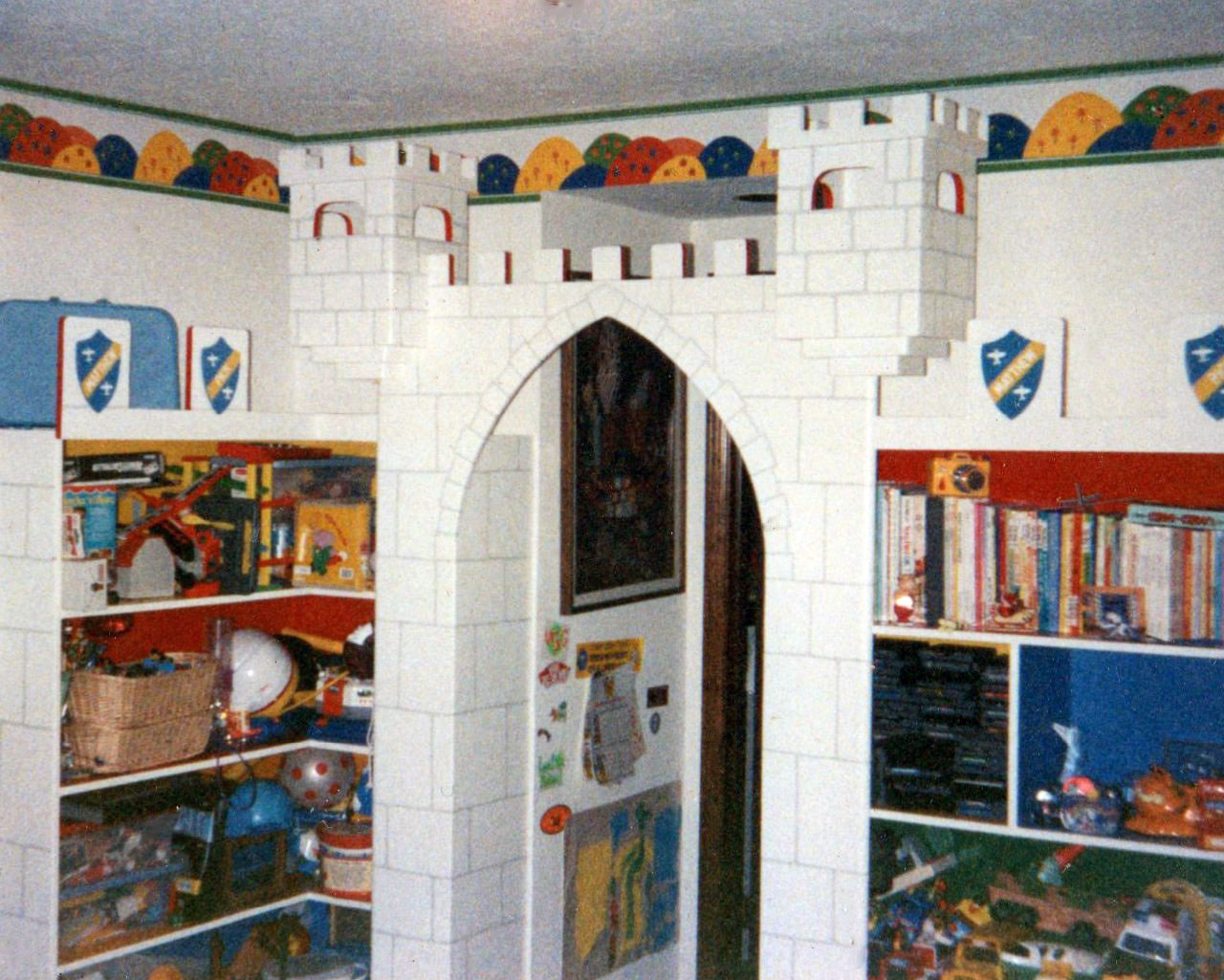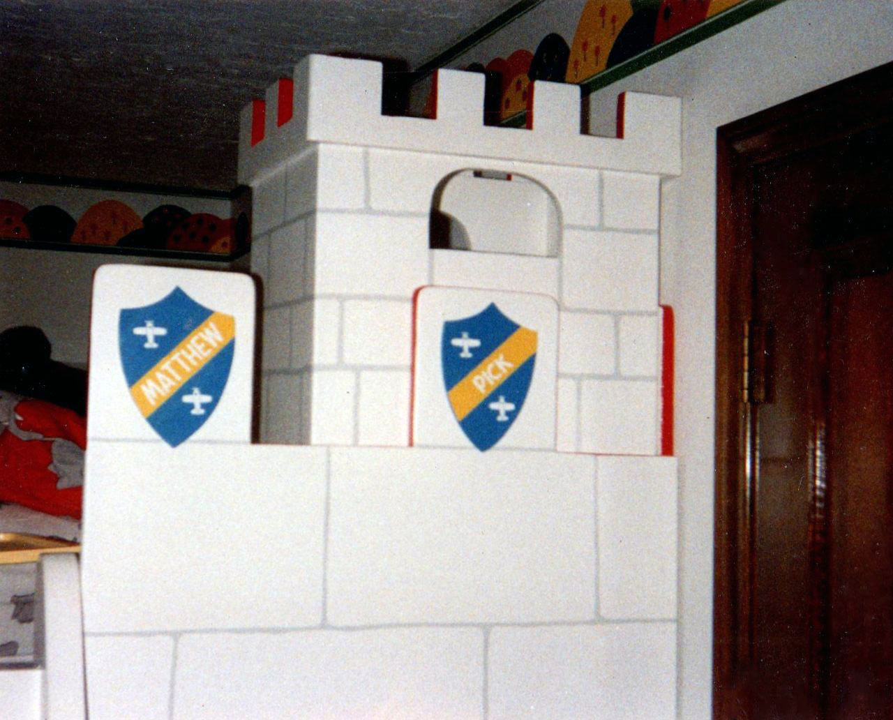 ALL CASTLES ARE CUSTOM MADE AND MEASURED TO FIT SPACE IN ROOM DESIRED. CUSTOM COLORS AND DESIGNS TO MATCH YOUR REQUIREMENTS. CASTLES ARE STURDY AND REQUIRE ATTACHMENT TO ONE WALL FOR SAFETY. ( THEY ARE NOT FREESTANDING ) ALL ARE MADE FROM BIRCH CABINET GRADE PLYWOOD WITH FIR OR PINE SUPPORTS.