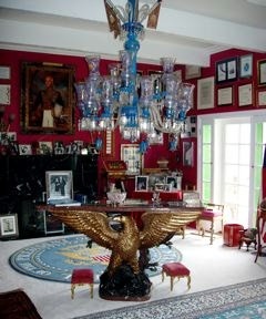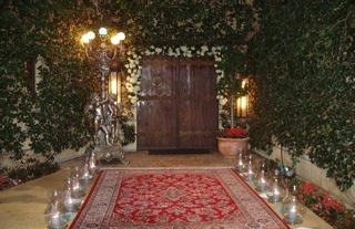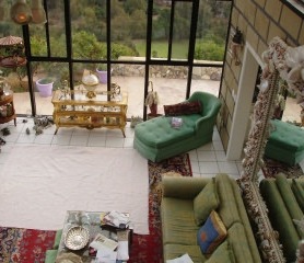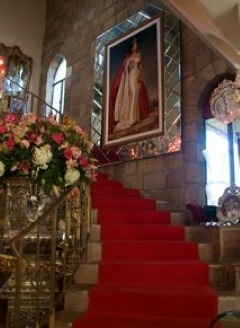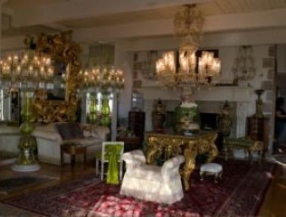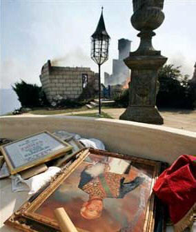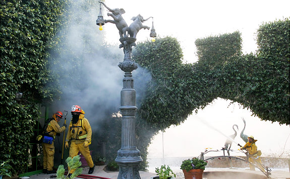 Lost to the flames was the Castle Kashan, the fairy-tale-like structure that stood for 30 years atop a Malibu hill, recognizable from below by its turrets and round towers. Also ravaged was Malibu Presbyterian Church, a high-steepled place of prayer and community action that had barely escaped destruction in the November 1993 infernos, which burned more than 300 homes in Malibu, Topanga and Calabasas. The castle, filled with paintings and Elvis Presley memorabilia, was one of several homes of socialite-philanthropist Lilly Lawrence, known as "Princess Lilly." Castle Kashan was named after the village of her father, Reza Fallah, a former Iranian oil minister under Shah Mohammad Reza Pahlavi. About 6:30 a.m., Lawrence and a house guest were trapped inside her sprawling home, but they managed to escape. Wearing a bathrobe, slippers and oversized sunglasses, Lawrence returned later to survey the wreckage and retrieve some belongings and emerged about 1:40 p.m. with friends carrying shopping bags. She thanked firefighters who remained outside battling the blaze. "My possessions don't possess me. My house does not possess me," she told them. "I'm thinking about our boys in Iraq. I'm thinking about you boys." Earlier this year, the six-bedroom, eight-bathroom castle overlooking Malibu Lagoon was listed for sale at $17 million. The 10,500-square-foot compound was in escrow briefly -- "for a minute" -- at an undisclosed price before Lawrence canceled the sale, she said Sunday. Lawrence said might consider rebuilding: "I'm keeping an open mind." The mansion was built in 1978 by a doctor, Thomas Hodges. Lawrence bought it in 1998 and spent a considerable fortune on remodeling. Television shows such as "The Rockford Files" were shot there and the castle was available to rent for weddings amid its romantic archways and lion sculptures. Lost in the fire were many works of art, family heirlooms, Faberge eggs and museum-worthy collections. Lawrence's library included signed photos from U.S. presidents. Firefighters were able to rescue a few paintings, including one believed to be a portrait of Lawrence's father, and piled some furniture and mementos in a dry fountain outside the house. Included was a snapshot of a woman shaking hands with President Lyndon B. Johnson. The castle's staircase was red-carpeted and a Cinderella-like glass slipper was kept on a step, attesting to Lawrence's humor and style. An incongruous feature was the rock 'n' roll room that Lawrence, a die-hard Elvis fan, had decorated with the couch-like seat from a 1959 Cadillac and a "Gates of Graceland" mural. Lawrence said among the few things she grabbed during her evacuation were Presley's Army fatigues, which she bought many years ago from Graceland.
