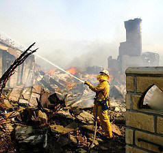The fire was one of at least 10 that scorched thousands of acres from Los Angeles to San Diego, killing one person and injuring 14, including four firefighters.
