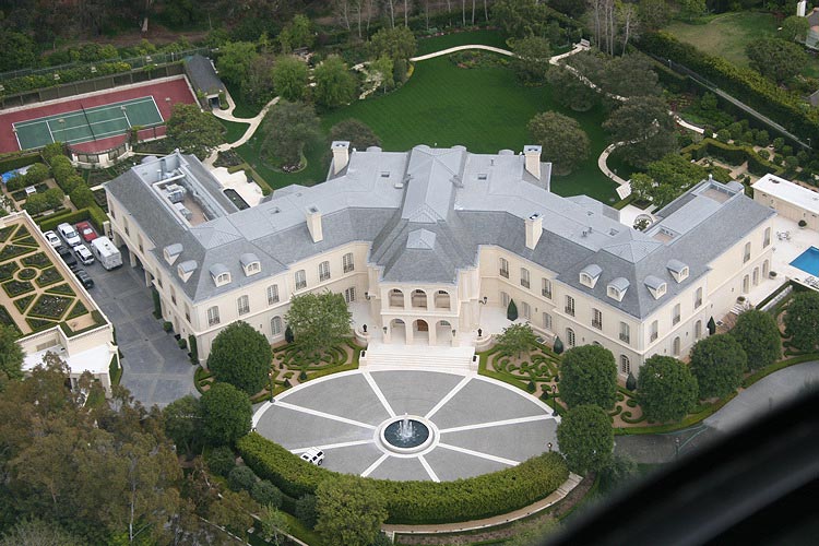 Lavish features also can be found outside the house, including a tennis court, fountains, a waterfall, a pool and spa, a reflection pool and a pool house with a kitchen, and 16 car ports, and a motor court that can amazingly accommodate 100 cars.